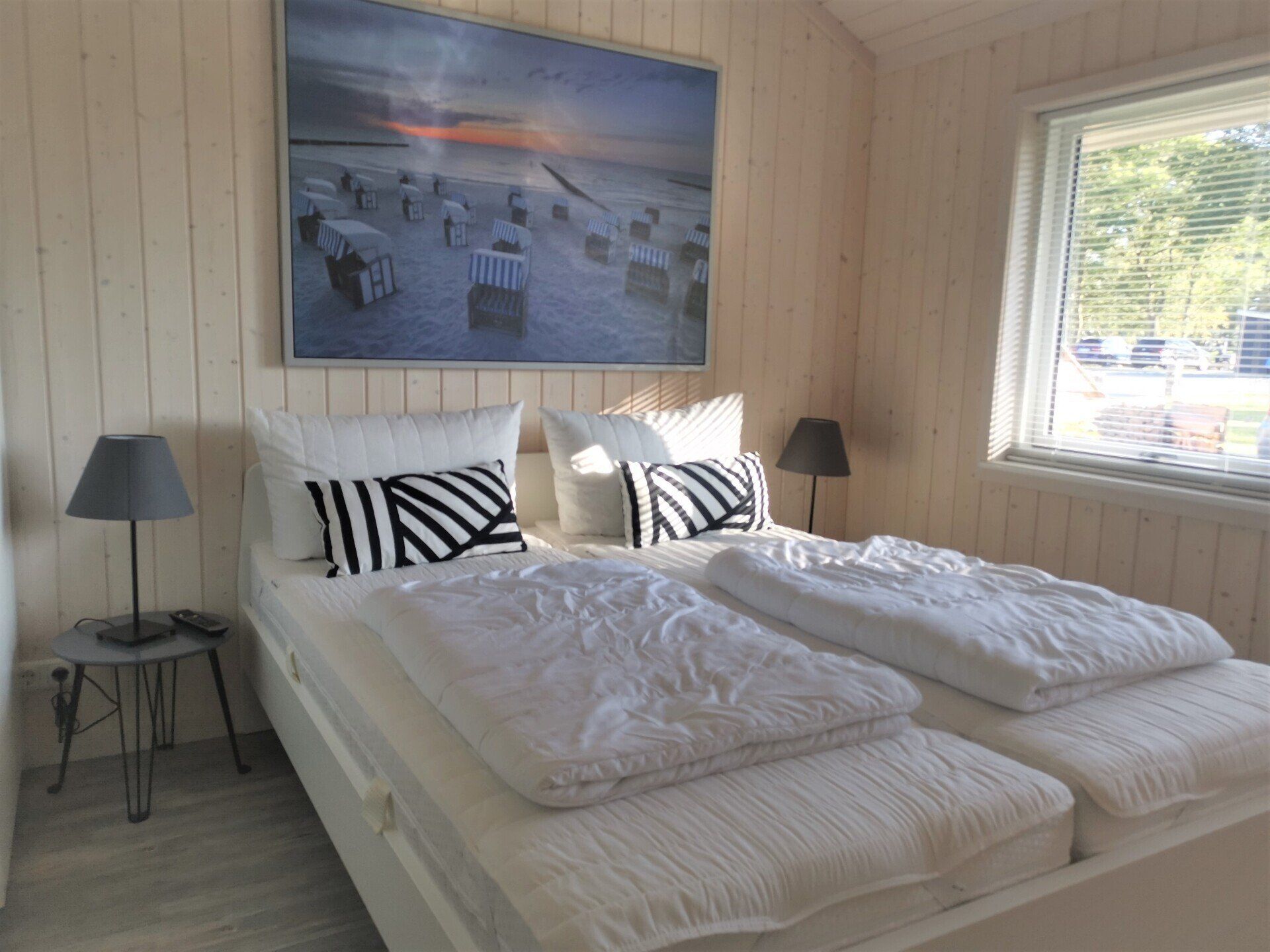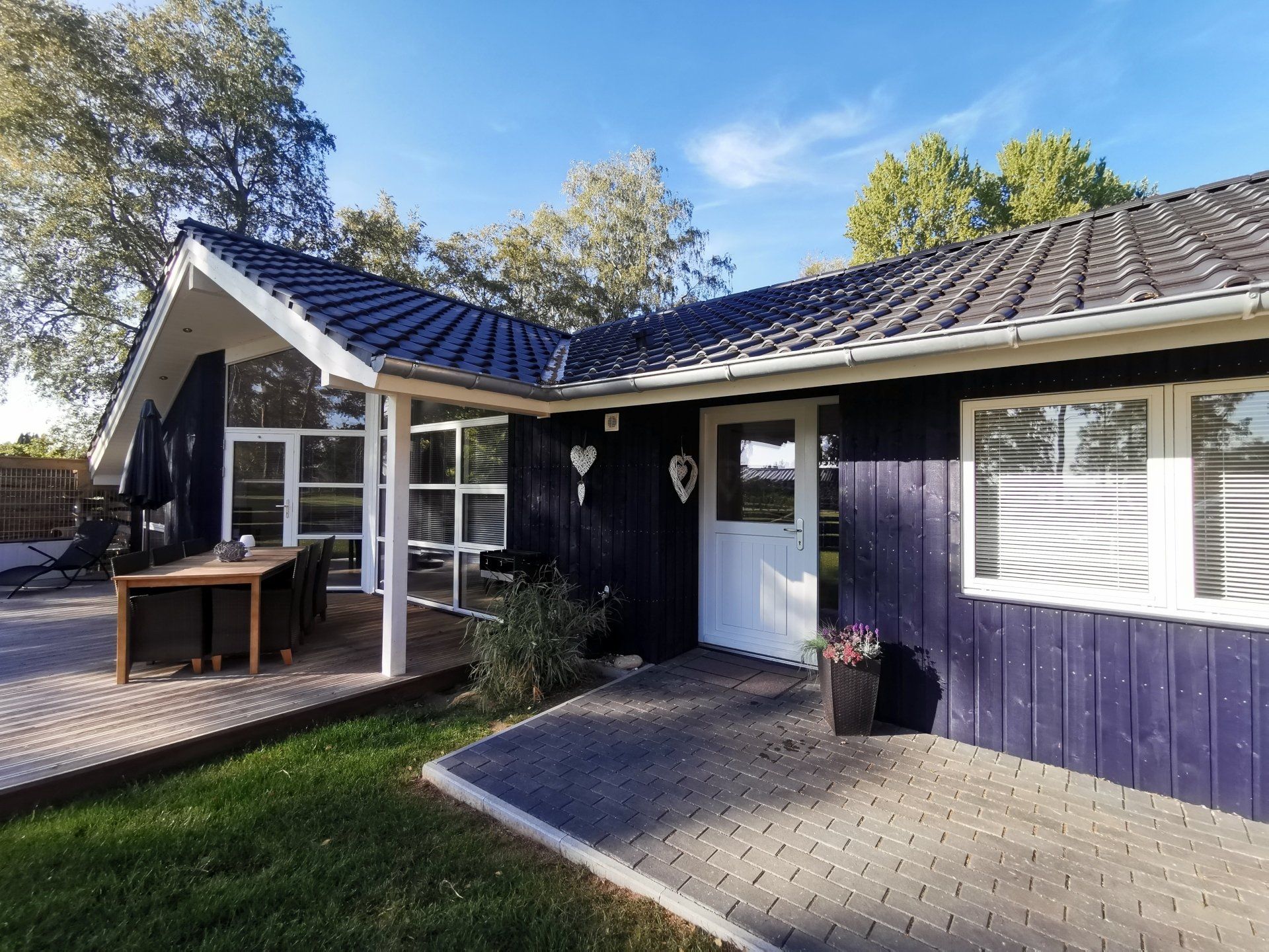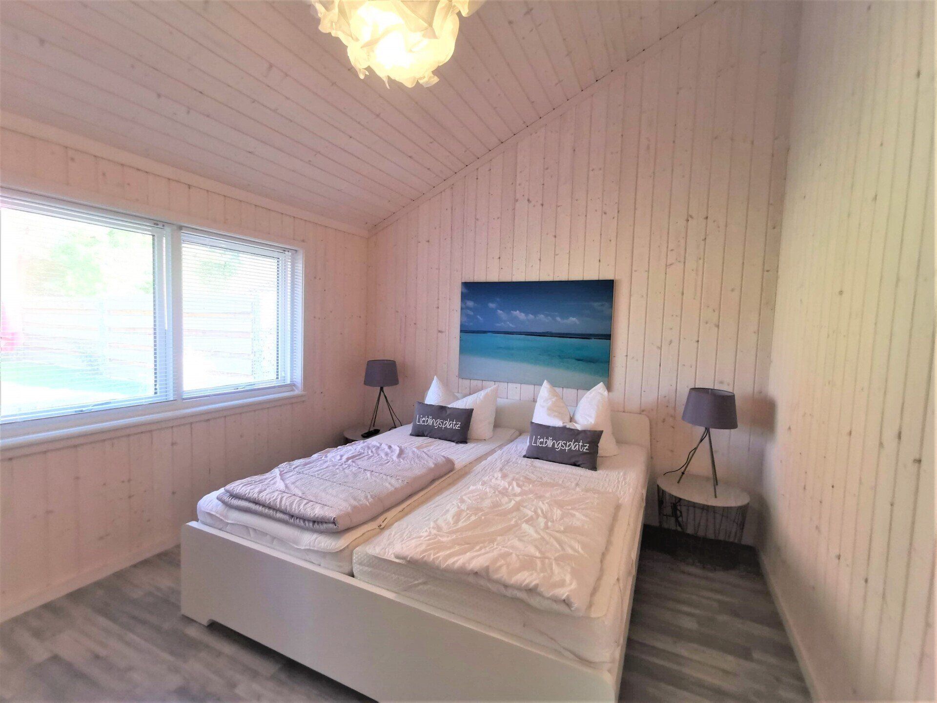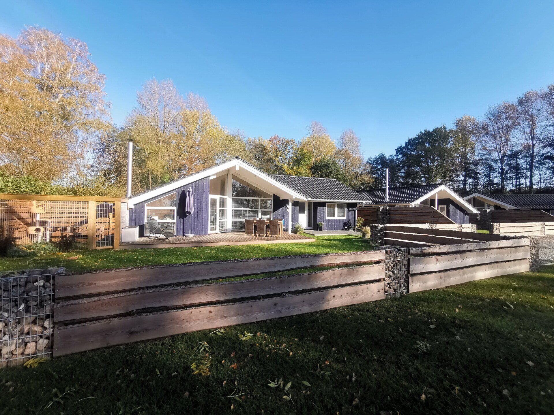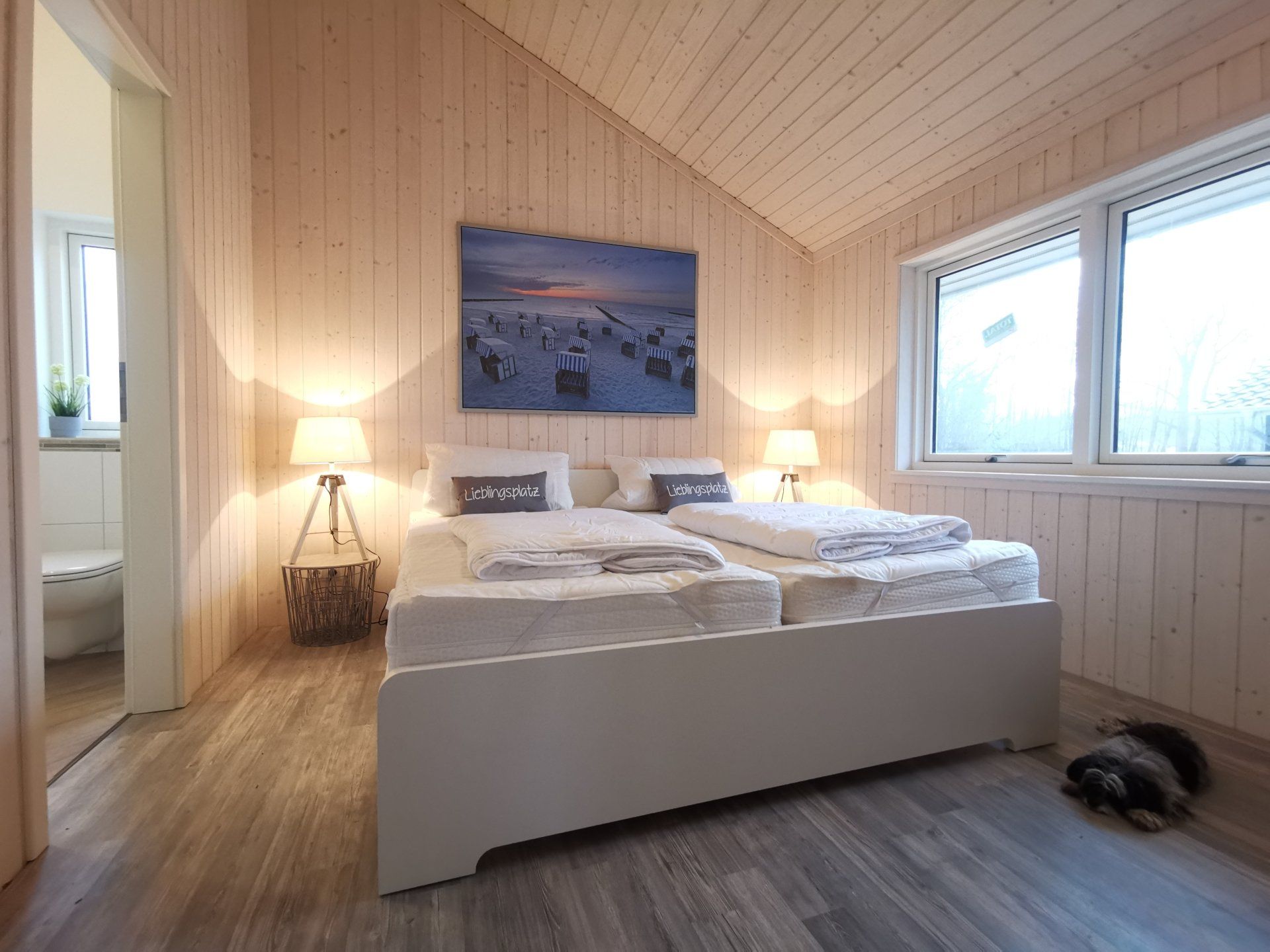 Ein Traumhaus, nur ein paar Schritte vom See entfernt. Mit wunderschönem Blick auf das Wasser vom lichtdurchfluteten Wohnzimmer aus und Platz für maximal 8 Personen. Durch die 3 Bäder ist es optimal ausgestattet um einer großen Familie oder zwei befreundete Familien. Alle Schlafzimmer sind jeweils mit TV ausgestattet und vom vorderen Schlafzimmer aus hat man ein tollen Blick auf den Sonnenuntergang überm See. Ein weiteres Schlafzimmer befindet sich im Bereich des vorderen Flurs, genauso wie der HWR mit Waschmaschine und Trockner sowie ein Duschbad mit Whirlwanne. Der Wohnbereich mit deckenhohen Fenstern über die gesamte Giebelfront lässt auch bei schlechten Wetter keine schlechte Laune aufkommen. Großzügig und mit viel Platz für alle sind hier Spieleabende am Esstisch oder Kinoabende auf der großen Eckcouch vorm 49" LED-TV vorprogrammiert. Die Küche gliedert sich über Eck dem Wohn- und Essbereich an und sollte durch Größe und Ausstattung sogar den etwas verwöhnten Hobbykoch erfreuen. Kühl-Gefrier-Kombi, großes Induktionskochfeld, Backofen, Mikrowelle, Kaffeemaschine, Dolce-Gusto, Toaster, Wasserkocher, Geschirrspüler und genügen Geschirr und Kochequipment sind natürlich vorhanden. Im hinteren Bereich befinden sich zwei weitere Schlafzimmer, das eine mit Ensuite-Duschbad und das Sauna-Bad mit einer weiteren Walk-In Dusche. Beide Schlaftrakte sind durch den geschickten Grundriss einzeln abgetrennt. Der Mittelpunkt von allem ist der Wohn- und Essbereich mit der Küche. In der Küche finden Sie die Terrassentür die Sie geradewegs auf die hintere Terrasse und in den hoch eingezäunten Garten führt. Die vordere Terrasse ist allein durch den Blick auf den See unschlagbar, aber für etwas mehr Ruhe und Privatsphäre ist die hintere Terrasse auf jeden Fall ein kleiner Tip. Hier kann man auch morgens schon beim Frühstück die ersten Sonnenstrahlen genießen denn Sie geht nach Westen raus. Gartenmöbel, Sonnenliegen und ein Grill runden die Ausstattung ab. Wir haben bei diesem Objekt im Übrigen darauf geachtet das es so gut es geht Barrierefrei ist, die Eingangstüren sind eben zu erreichen und alle Innentüren sind 86 cm breit. 2-3 Autos können Sie vorne auf dem Gemeinschaftsparkplatz für unsere Objekte abstellen.