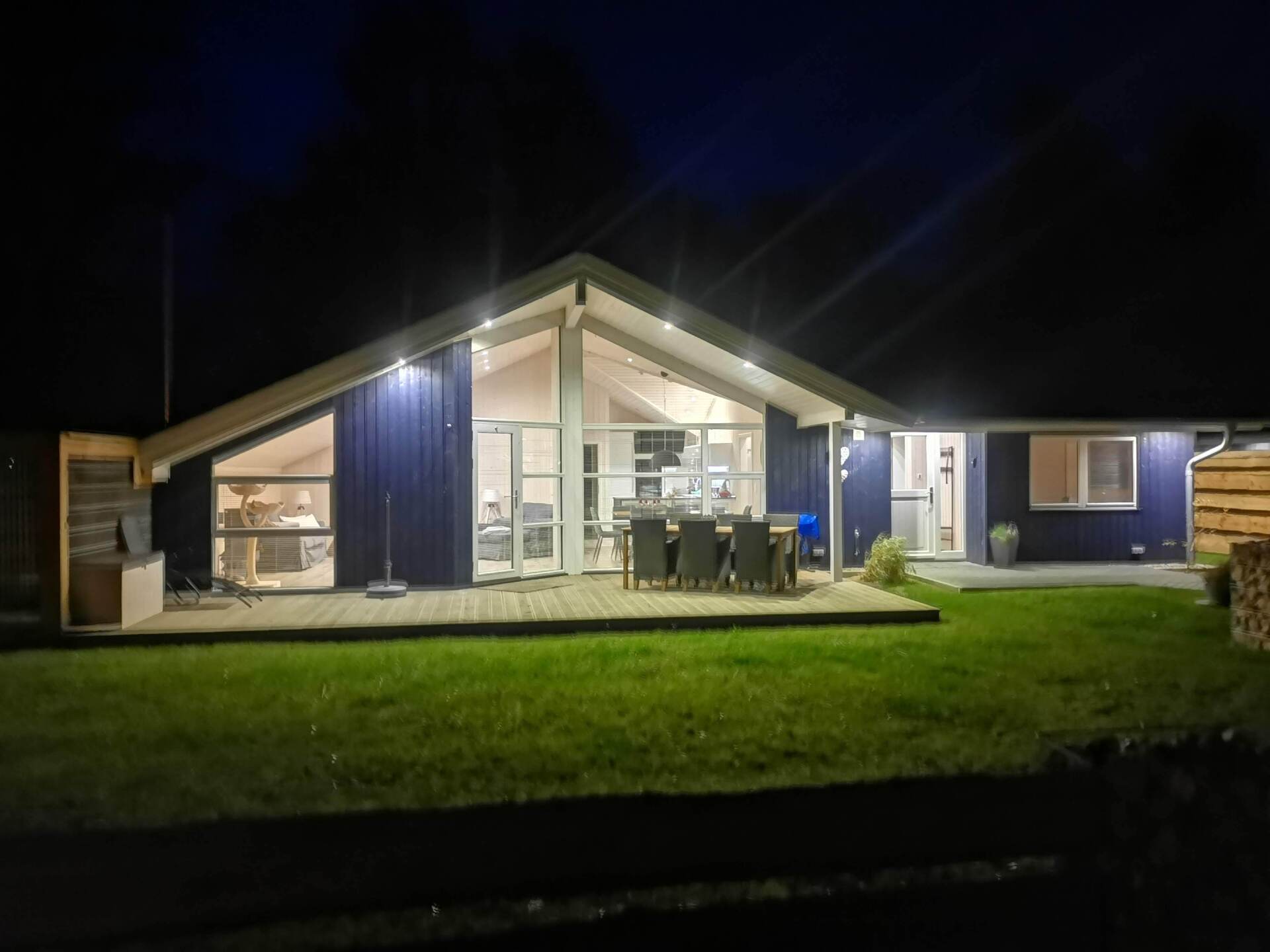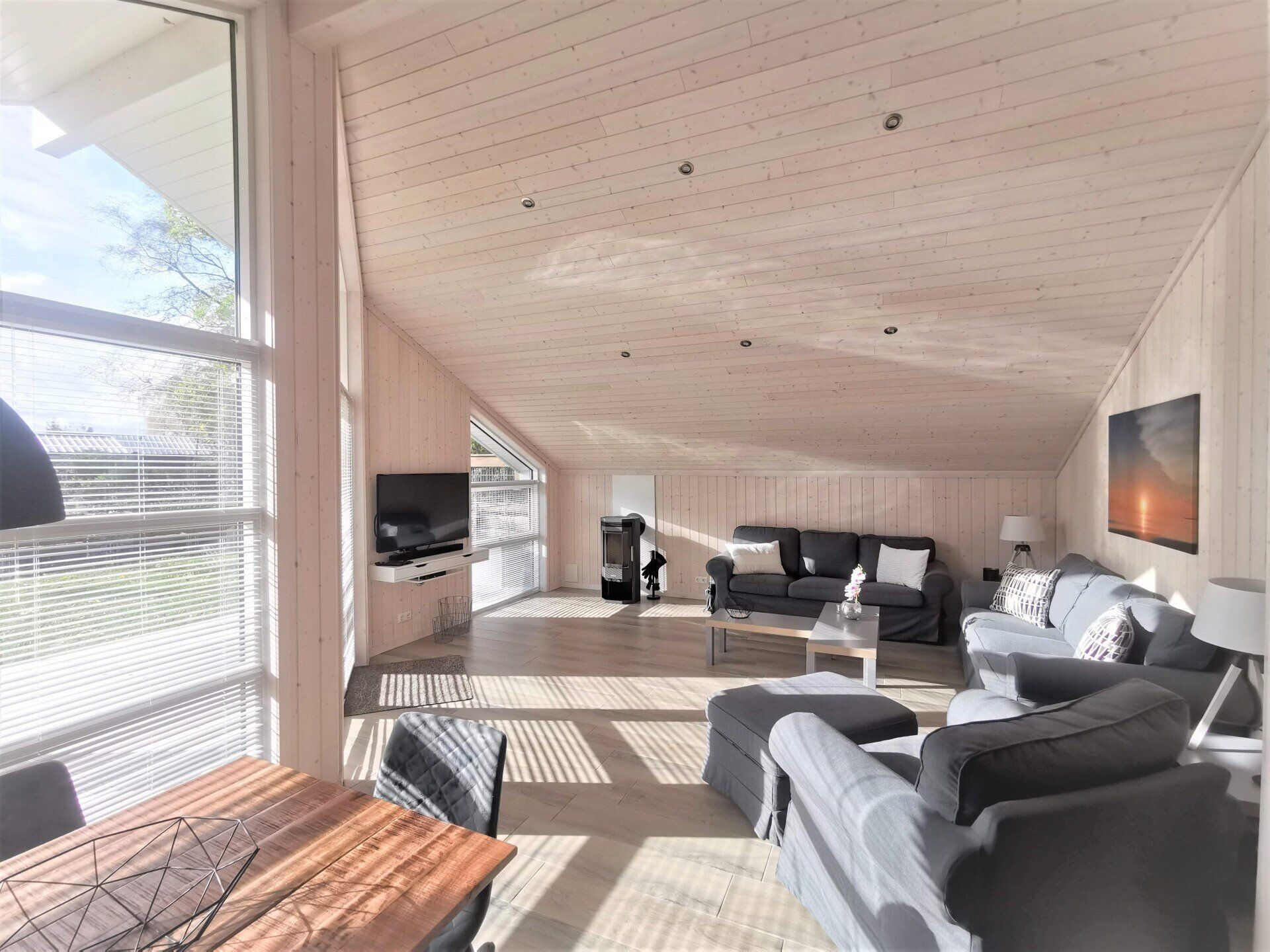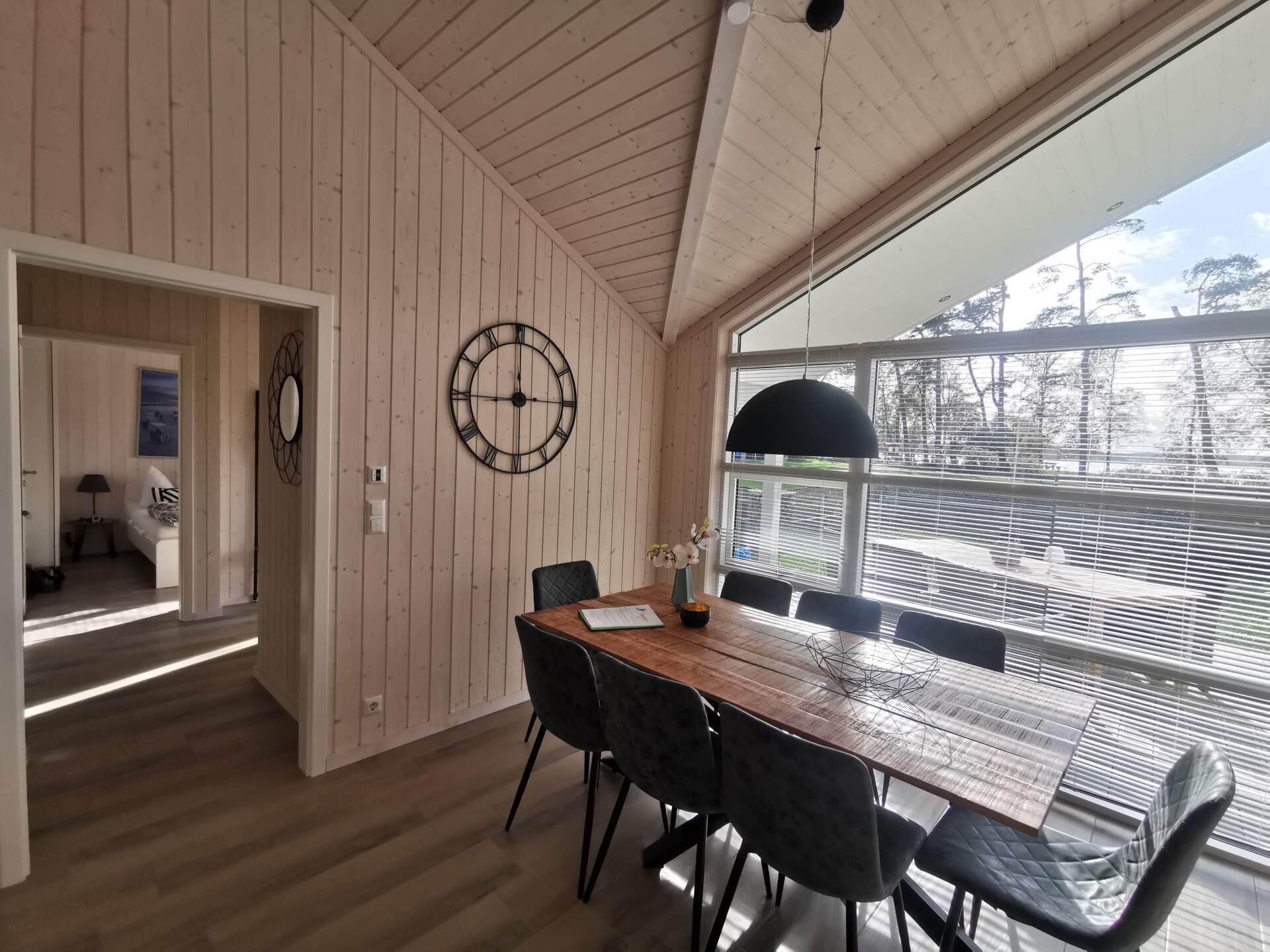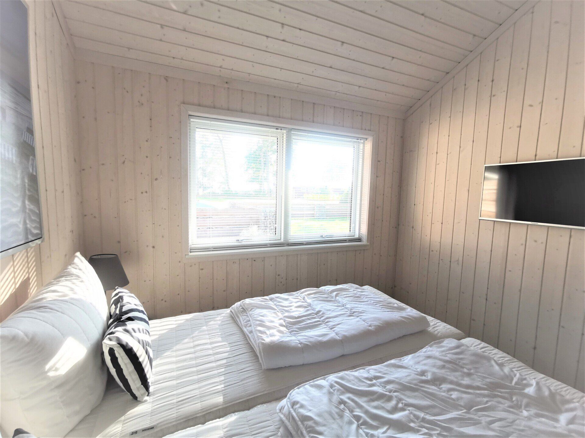 Ein Traumhaus, nur ein paar Schritte vom See entfernt. Mit wunderschönem Blick auf das Wasser vom lichtdurchfluteten Wohnzimmer aus und Platz für maximal 8 Personen. Durch die 3 Bäder ist es optimal ausgestattet um einer großen Familie oder zwei befreundete Familien. Alle Schlafzimmer sind jeweils mit TV ausgestattet und vom vorderen Schlafzimmer aus hat man ein tollen Blick auf den Sonnenuntergang überm See. Ein weiteres Schlafzimmer befindet sich im Bereich des vorderen Flurs, genauso wie der HWR mit Waschmaschine und Trockner sowie ein Duschbad mit Whirlwanne. Der Wohnbereich mit deckenhohen Fenstern über die gesamte Giebelfront lässt auch bei schlechten Wetter keine schlechte Laune aufkommen. Großzügig und mit viel Platz für alle sind hier Spieleabende am Esstisch oder Kinoabende auf der großen Eckcouch vorm 49" LED-TV vorprogrammiert. Die Küche gliedert sich über Eck dem Wohn- und Essbereich an und sollte durch Größe und Ausstattung sogar den etwas verwöhnten Hobbykoch erfreuen. Kühl-Gefrier-Kombi, großes Induktionskochfeld, Backofen, Mikrowelle, Kaffeemaschine, Dolce-Gusto, Toaster, Wasserkocher, Geschirrspüler und genügen Geschirr und Kochequipment sind natürlich vorhanden. Im hinteren Bereich befinden sich zwei weitere Schlafzimmer, das eine mit Ensuite-Duschbad und das Sauna-Bad mit einer weiteren Walk-In Dusche. Beide Schlaftrakte sind durch den geschickten Grundriss einzeln abgetrennt. Der Mittelpunkt von allem ist der Wohn- und Essbereich mit der Küche. In der Küche finden Sie die Terrassentür die Sie geradewegs auf die hintere Terrasse und in den hoch eingezäunten Garten führt. Die vordere Terrasse ist allein durch den Blick auf den See unschlagbar, aber für etwas mehr Ruhe und Privatsphäre ist die hintere Terrasse auf jeden Fall ein kleiner Tip. Hier kann man auch morgens schon beim Frühstück die ersten Sonnenstrahlen genießen denn Sie geht nach Westen raus. Gartenmöbel, Sonnenliegen und ein Grill runden die Ausstattung ab. Wir haben bei diesem Objekt im Übrigen darauf geachtet das es so gut es geht Barrierefrei ist, die Eingangstüren sind eben zu erreichen und alle Innentüren sind 86 cm breit. 2-3 Autos können Sie vorne auf dem Gemeinschaftsparkplatz für unsere Objekte abstellen.