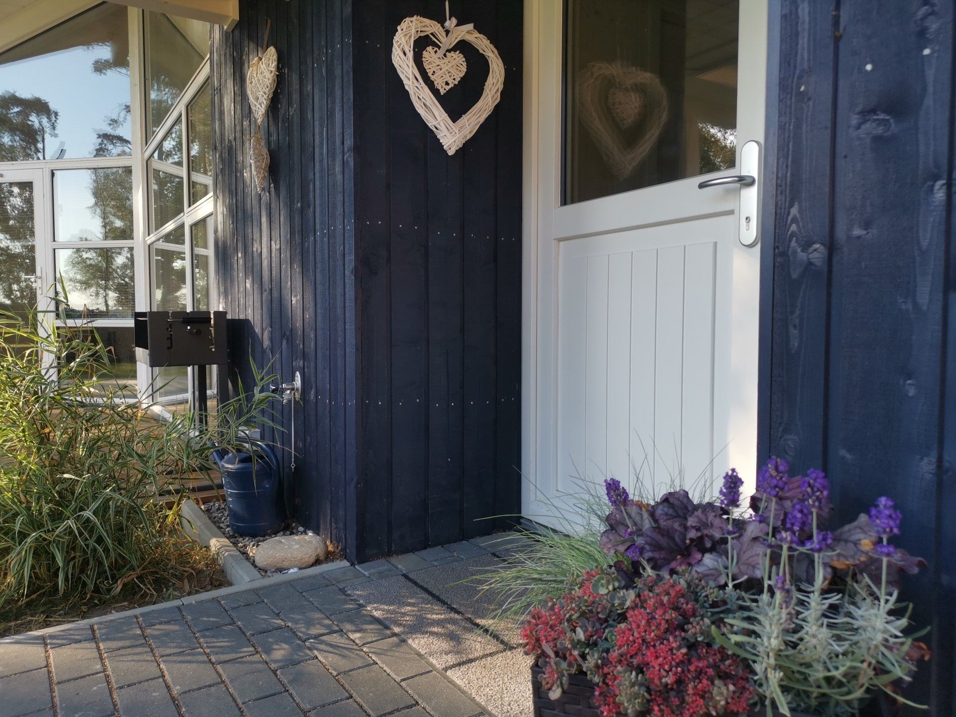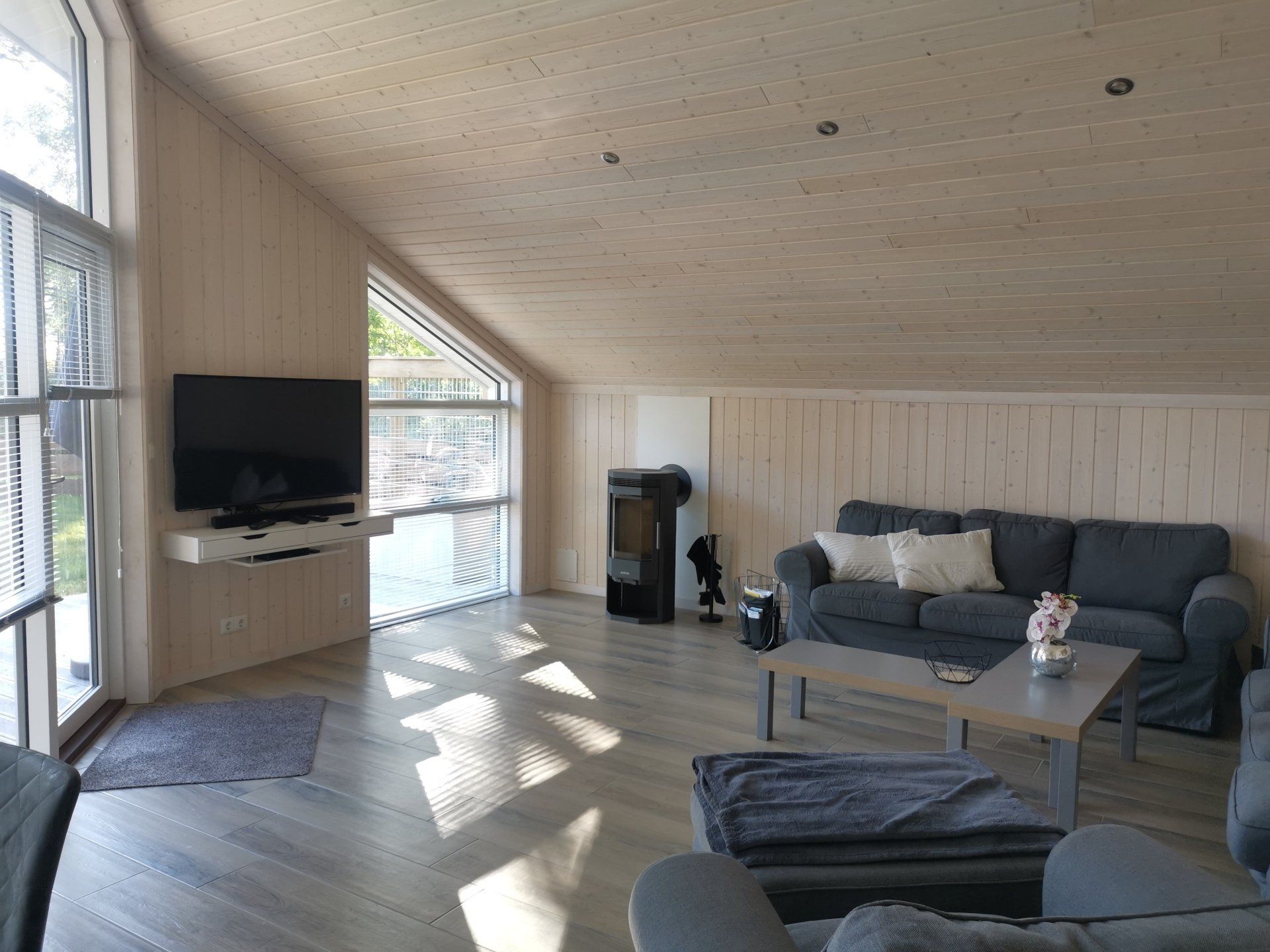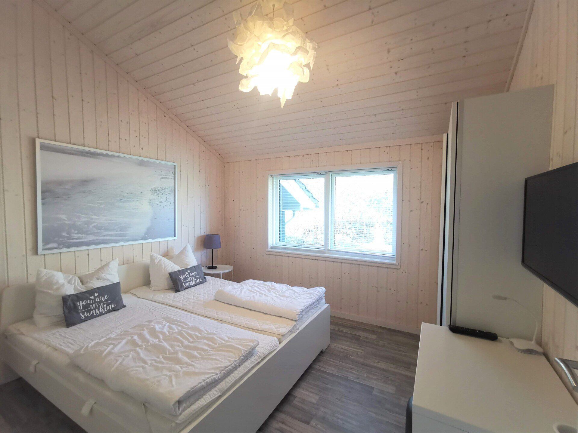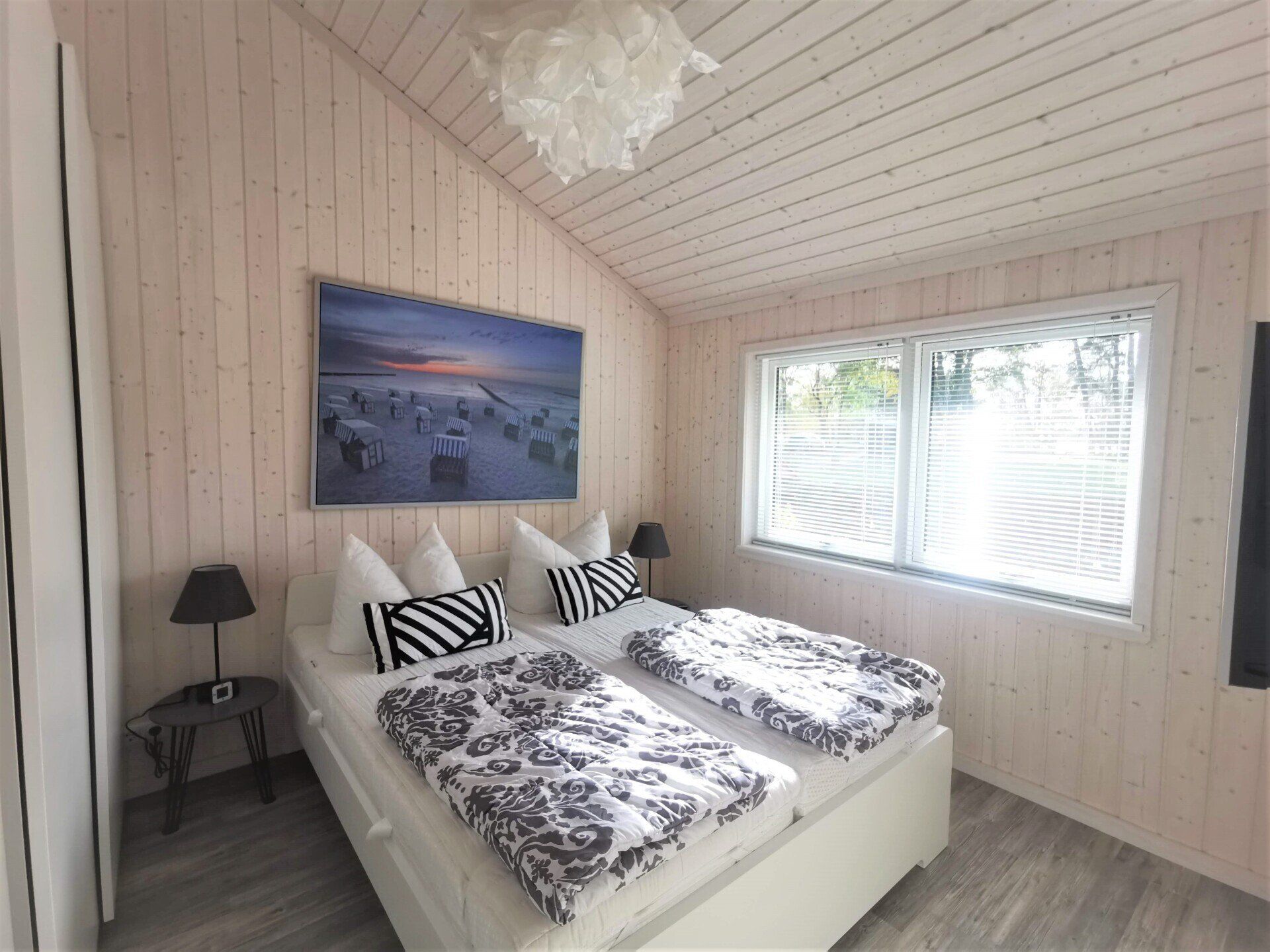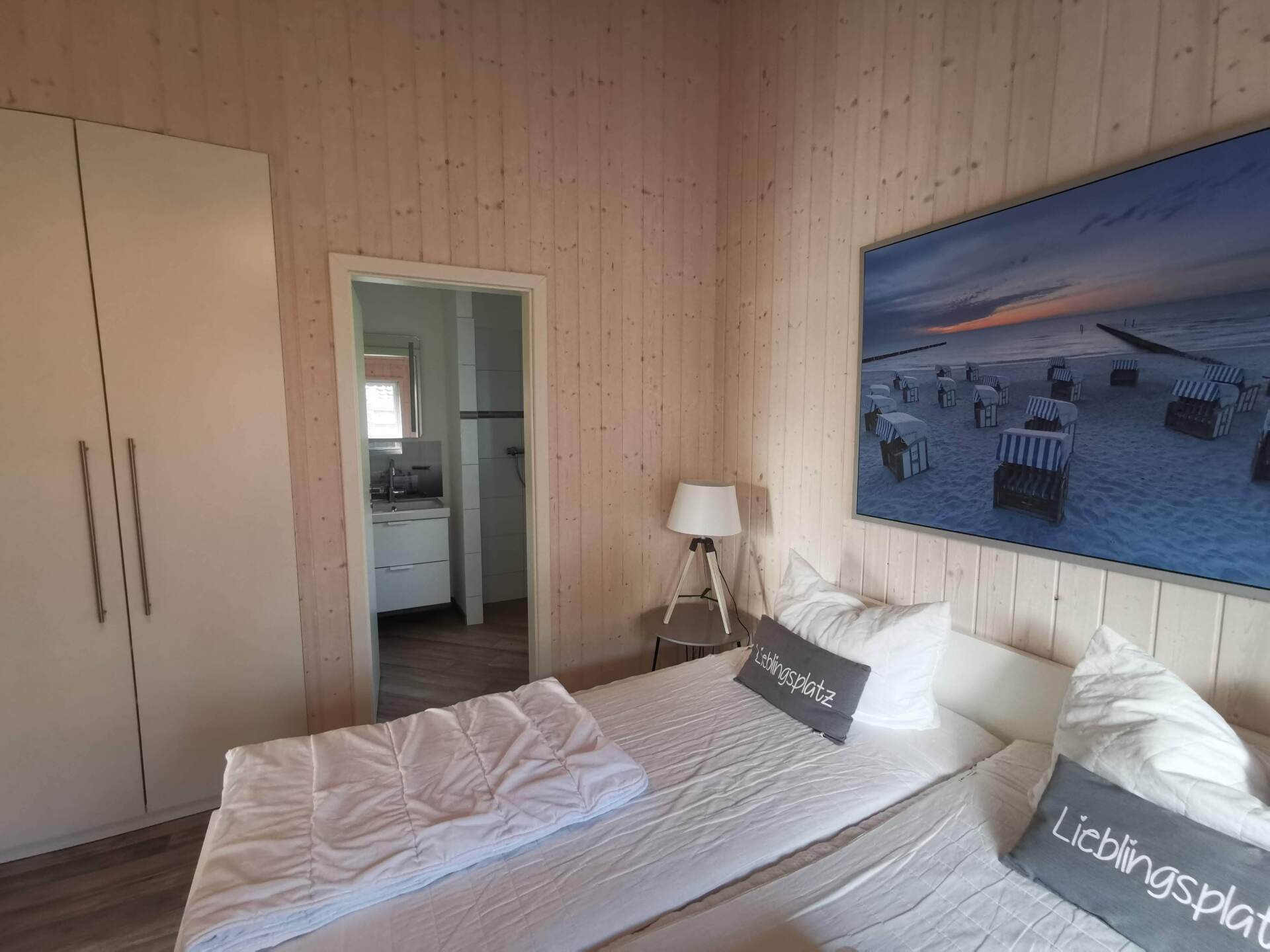Ein Traumhaus, nur ein paar Schritte vom See entfernt. Mit wunderschönem Blick auf das Wasser vom lichtdurchfluteten Wohnzimmer aus und Platz für maximal 8 Personen. Durch die 3 Bäder ist es optimal ausgestattet um einer großen Familie oder zwei befreundete Familien. Alle Schlafzimmer sind jeweils mit TV ausgestattet und vom vorderen Schlafzimmer aus hat man ein tollen Blick auf den Sonnenuntergang überm See. Ein weiteres Schlafzimmer befindet sich im Bereich des vorderen Flurs, genauso wie der HWR mit Waschmaschine und Trockner sowie ein Duschbad mit Whirlwanne. Der Wohnbereich mit deckenhohen Fenstern über die gesamte Giebelfront lässt auch bei schlechten Wetter keine schlechte Laune aufkommen. Großzügig und mit viel Platz für alle sind hier Spieleabende am Esstisch oder Kinoabende auf der großen Eckcouch vorm 49" LED-TV vorprogrammiert. Die Küche gliedert sich über Eck dem Wohn- und Essbereich an und sollte durch Größe und Ausstattung sogar den etwas verwöhnten Hobbykoch erfreuen. Kühl-Gefrier-Kombi, großes Induktionskochfeld, Backofen, Mikrowelle, Kaffeemaschine, Dolce-Gusto, Toaster, Wasserkocher, Geschirrspüler und genügen Geschirr und Kochequipment sind natürlich vorhanden. Im hinteren Bereich befinden sich zwei weitere Schlafzimmer, das eine mit Ensuite-Duschbad und das Sauna-Bad mit einer weiteren Walk-In Dusche. Beide Schlaftrakte sind durch den geschickten Grundriss einzeln abgetrennt. Der Mittelpunkt von allem ist der Wohn- und Essbereich mit der Küche. In der Küche finden Sie die Terrassentür die Sie geradewegs auf die hintere Terrasse und in den hoch eingezäunten Garten führt. Die vordere Terrasse ist allein durch den Blick auf den See unschlagbar, aber für etwas mehr Ruhe und Privatsphäre ist die hintere Terrasse auf jeden Fall ein kleiner Tip. Hier kann man auch morgens schon beim Frühstück die ersten Sonnenstrahlen genießen denn Sie geht nach Westen raus. Gartenmöbel, Sonnenliegen und ein Grill runden die Ausstattung ab. Wir haben bei diesem Objekt im Übrigen darauf geachtet das es so gut es geht Barrierefrei ist, die Eingangstüren sind eben zu erreichen und alle Innentüren sind 86 cm breit. 2-3 Autos können Sie vorne auf dem Gemeinschaftsparkplatz für unsere Objekte abstellen.