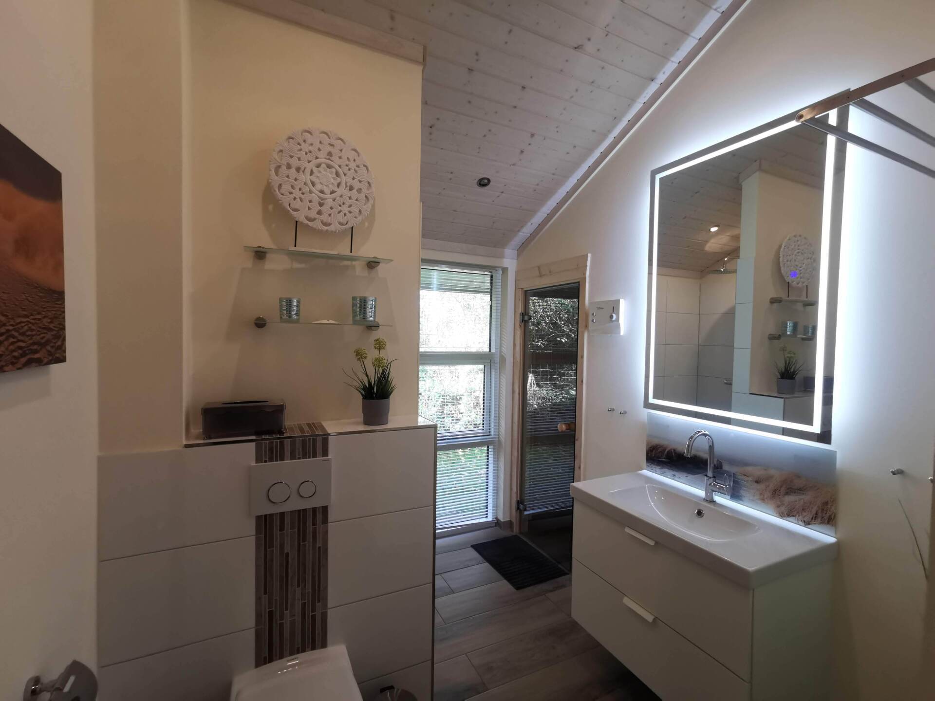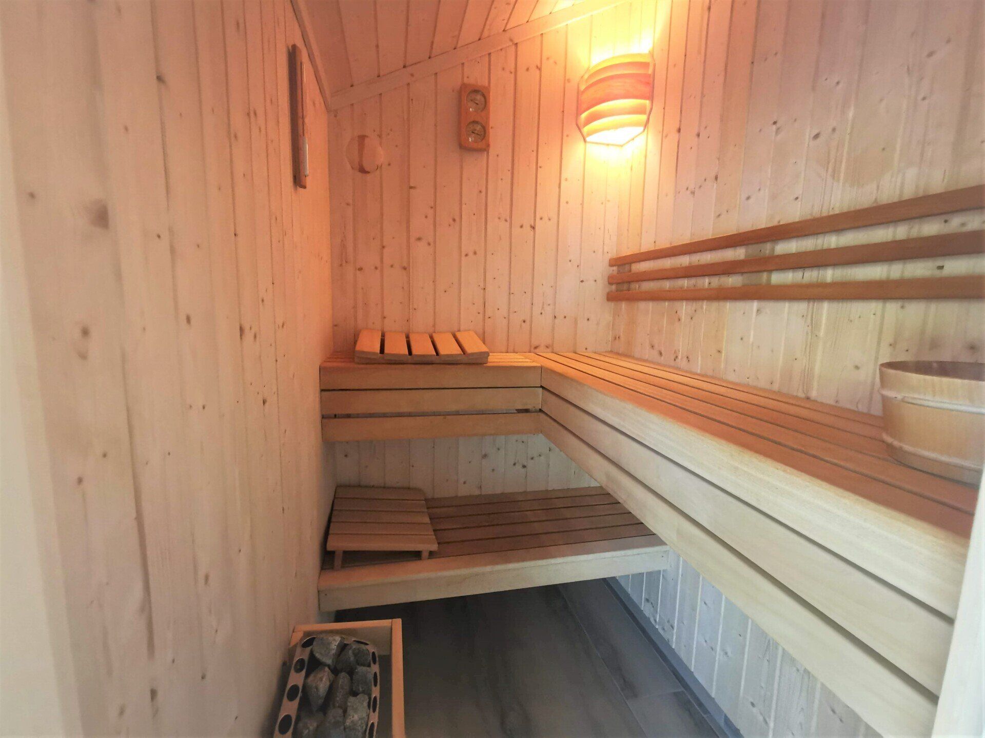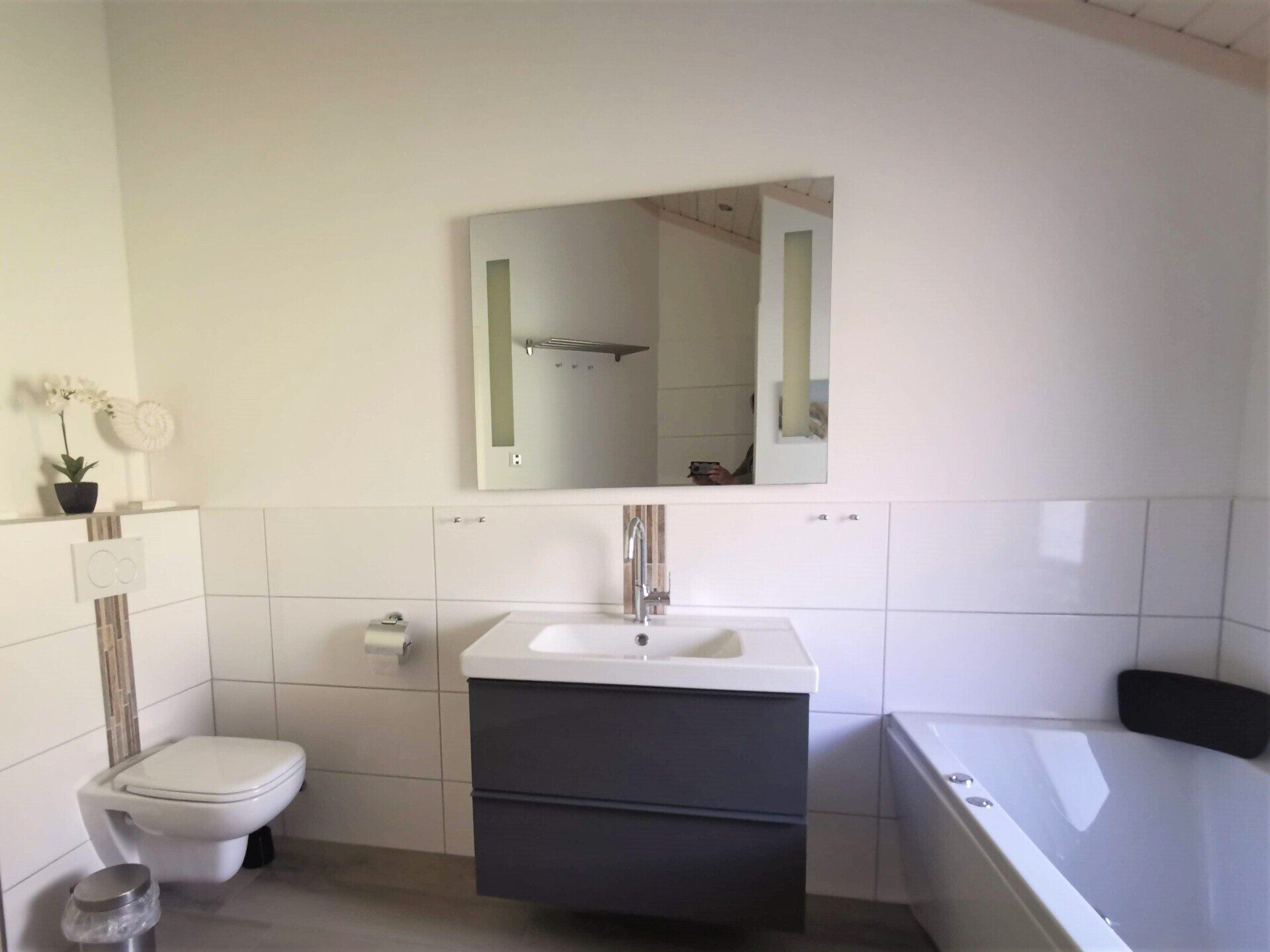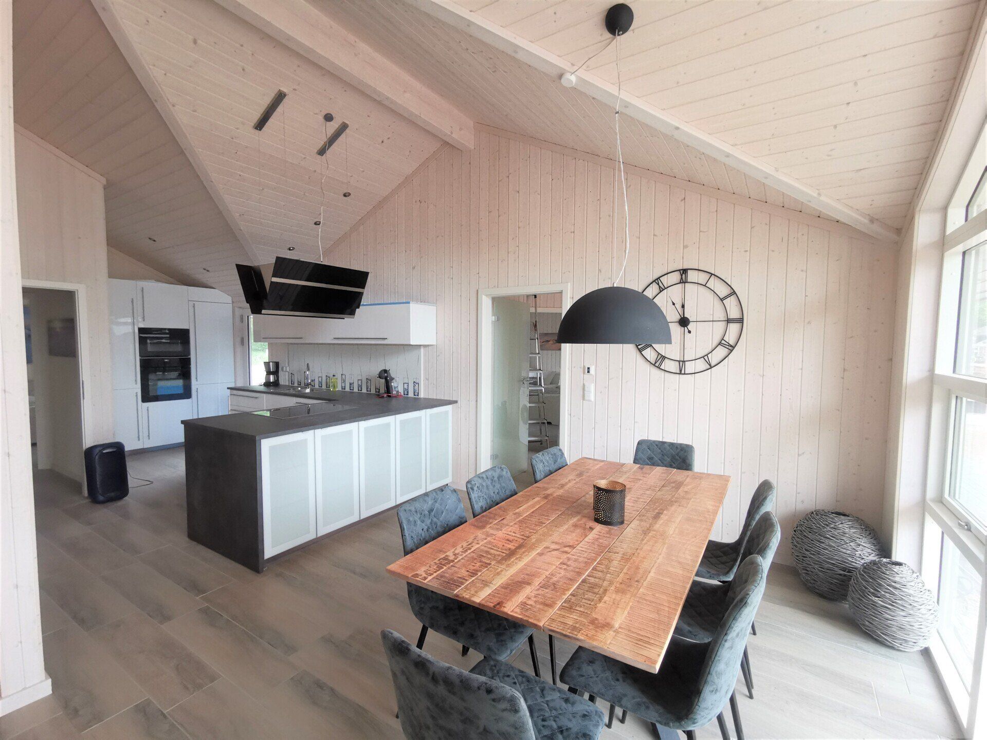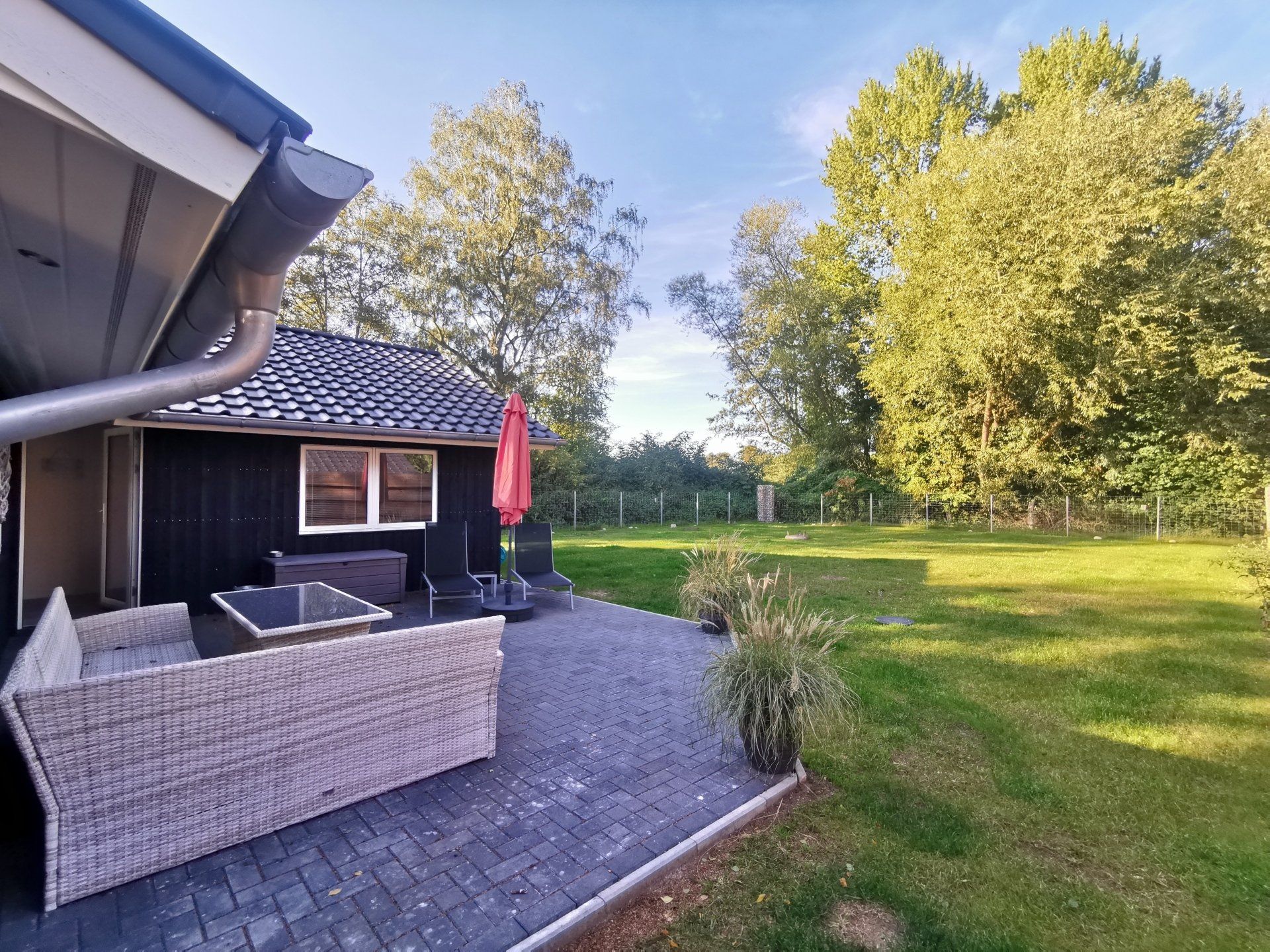 Ein Traumhaus, nur ein paar Schritte vom See entfernt. Mit wunderschönem Blick auf das Wasser vom lichtdurchfluteten Wohnzimmer aus und Platz für maximal 8 Personen. Durch die 3 Bäder ist es optimal ausgestattet um einer großen Familie oder zwei befreundete Familien. Alle Schlafzimmer sind jeweils mit TV ausgestattet und vom vorderen Schlafzimmer aus hat man ein tollen Blick auf den Sonnenuntergang überm See. Ein weiteres Schlafzimmer befindet sich im Bereich des vorderen Flurs, genauso wie der HWR mit Waschmaschine und Trockner sowie ein Duschbad mit Whirlwanne. Der Wohnbereich mit deckenhohen Fenstern über die gesamte Giebelfront lässt auch bei schlechten Wetter keine schlechte Laune aufkommen. Großzügig und mit viel Platz für alle sind hier Spieleabende am Esstisch oder Kinoabende auf der großen Eckcouch vorm 49" LED-TV vorprogrammiert. Die Küche gliedert sich über Eck dem Wohn- und Essbereich an und sollte durch Größe und Ausstattung sogar den etwas verwöhnten Hobbykoch erfreuen. Kühl-Gefrier-Kombi, großes Induktionskochfeld, Backofen, Mikrowelle, Kaffeemaschine, Dolce-Gusto, Toaster, Wasserkocher, Geschirrspüler und genügen Geschirr und Kochequipment sind natürlich vorhanden. Im hinteren Bereich befinden sich zwei weitere Schlafzimmer, das eine mit Ensuite-Duschbad und das Sauna-Bad mit einer weiteren Walk-In Dusche. Beide Schlaftrakte sind durch den geschickten Grundriss einzeln abgetrennt. Der Mittelpunkt von allem ist der Wohn- und Essbereich mit der Küche. In der Küche finden Sie die Terrassentür die Sie geradewegs auf die hintere Terrasse und in den hoch eingezäunten Garten führt. Die vordere Terrasse ist allein durch den Blick auf den See unschlagbar, aber für etwas mehr Ruhe und Privatsphäre ist die hintere Terrasse auf jeden Fall ein kleiner Tip. Hier kann man auch morgens schon beim Frühstück die ersten Sonnenstrahlen genießen denn Sie geht nach Westen raus. Gartenmöbel, Sonnenliegen und ein Grill runden die Ausstattung ab. Wir haben bei diesem Objekt im Übrigen darauf geachtet das es so gut es geht Barrierefrei ist, die Eingangstüren sind eben zu erreichen und alle Innentüren sind 86 cm breit. 2-3 Autos können Sie vorne auf dem Gemeinschaftsparkplatz für unsere Objekte abstellen.